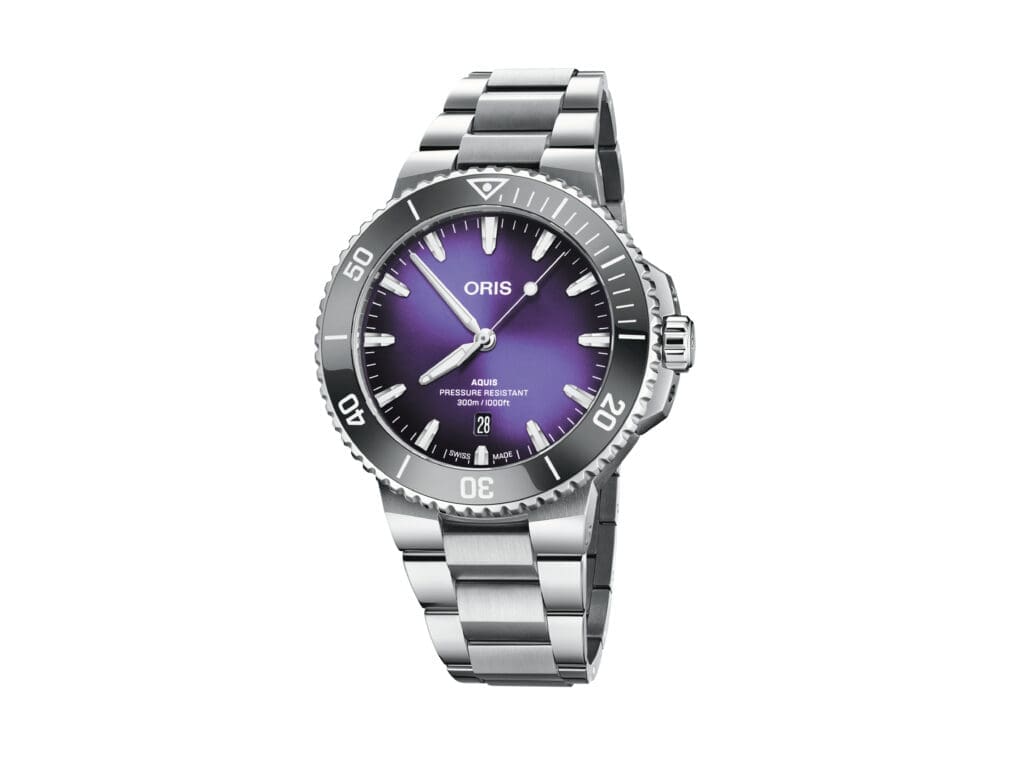 Avec cette jolie plongeuse, Oris célèbre la belle saison en version pop et solaire. Une édition spéciale Aquis Date de 43,5 mm qui arbore un cadran myrtille et une lunette tungstène effet miroir. Montée sur un bracelet en acier, elle offre toutes les caractéristiques de la montre de plongée idéale pour l’été (étanche 300 m, mouvement