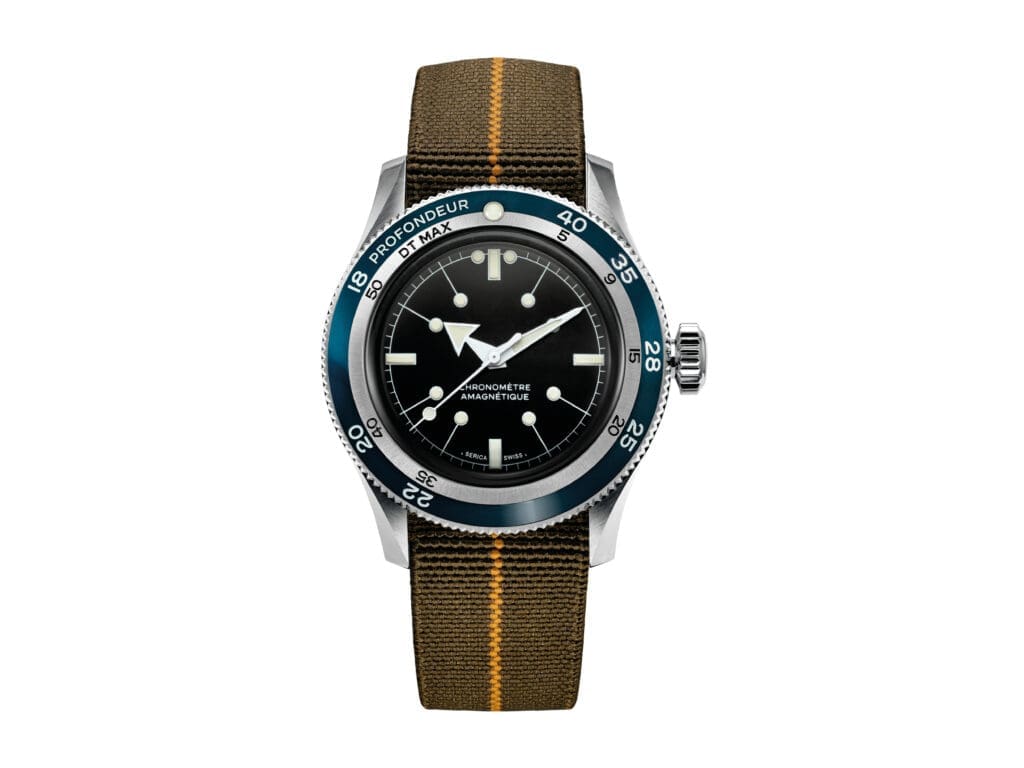 En collaborant avec les plongeurs démineurs français, Serica a adapté son chronomètre à leurs missions extrêmes. Lunette « DT MAX » céramique bleu abyssal, mouvement mécanique amagnétique COSC, grande aiguille « Fat Lollipop », cadran noir émaillé et bracelets historiques revisités font de cette montre un outil d’exception. Édition limitée à 500 exemplaires (dont 350 civiles). Prix : 1 690 €.