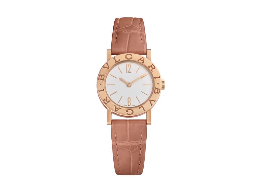 Lancé en 1977, ce modèle emblématique unisexe arrive en or rose, sur bracelet en alligator beige. Il encapsule la quintessence de l’horloger-joaillier romain avec ses écritures inspirées des inscriptions des monnaies antiques. Prix : 9 100 €.