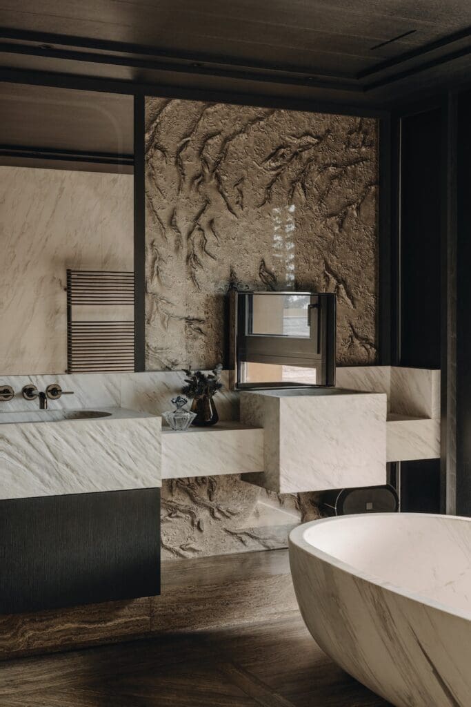 Partout, jusque dans les 51 chambres et suites, toutes avec terrasse, dont deux appartements signature, Tristan Auer a composé des intérieurs d’un raffinement rare, du sur-mesure avec des mariages d’étoffes, des jeux de miroirs, des variations de bois sculpté, de pierre gravée du plus bel effet. Avec ce fameux souci du détail qui s’exprime pleinement ici et là. De la double tête de lit à la table de chevet sculpturale, du plafond modelé aux lavabos en marbre aux formes organiques, chaque élément du décor a du sens et contribue à créer un ensemble harmonieux, apaisant, chaleureux. Le spectaculaire Appartement Jardin Alpin de 552 m2, réalisé par Studio KO, est de la même veine. L’Asaya Spa également. Là encore, dès l’entrée, le comptoir, un bloc de marbre blanc brisé et façonné au marteau pour lui donner l’apparence de la neige, suscite la curiosité. Le spa propose des soins EviDens de Beauté et Sodashi, des expériences high-tech de pointe (LED, ultrasons, cryothérapie…), saunas, hammams, jacuzzi, douche sensorielle, une piscine de 17 mètres de long et, à l’écart, encore une surprise, la pataugeoire avec des jets d’eau, nichée… au fond d’une grotte. Les enfants, à leur tour, vont être épatés.