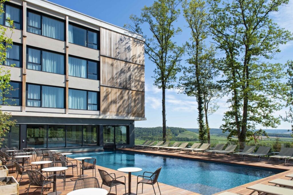 Posté à l’orée de la forêt, à quelques minutes d’Épernay, cet hôtel conçu par le studio parisien Jouin-Manku se démarque par son architecture brute et son design pointu. La façade en bois blond est rythmée par les grandes baies vitrées qui facilitent l’immersion dans la nature environnante. La décoration des 101 chambres fait la part belle aux matériaux bruts (cuir, bois de chêne, laine, lin, béton) et aux teintes minérales. Le restaurant L’Horisium sert une cuisine parfumée d’inspiration locavore. Pour des moments détente, direction le spa de 1 000 m2 et la piscine extérieure chauffée, au ras des vignes.
