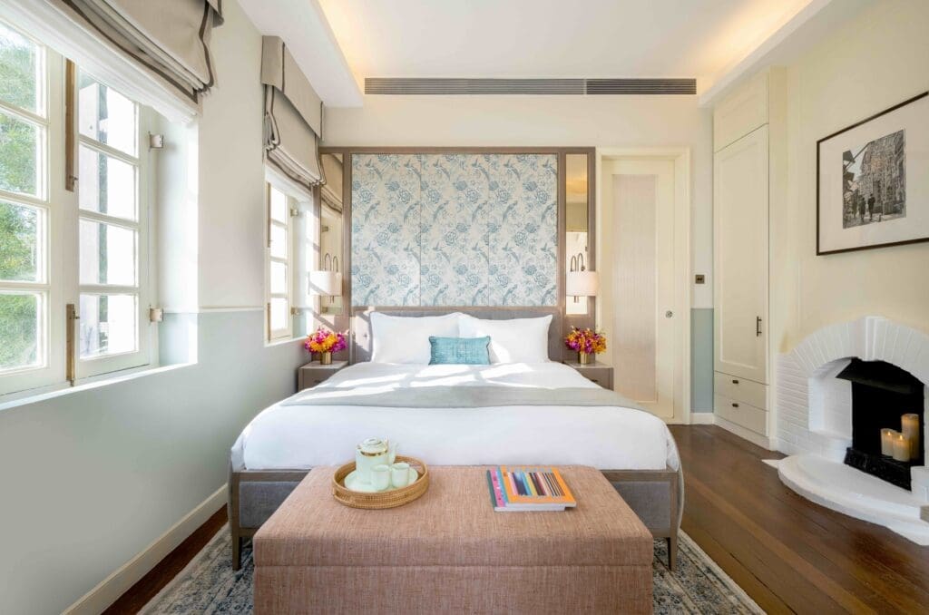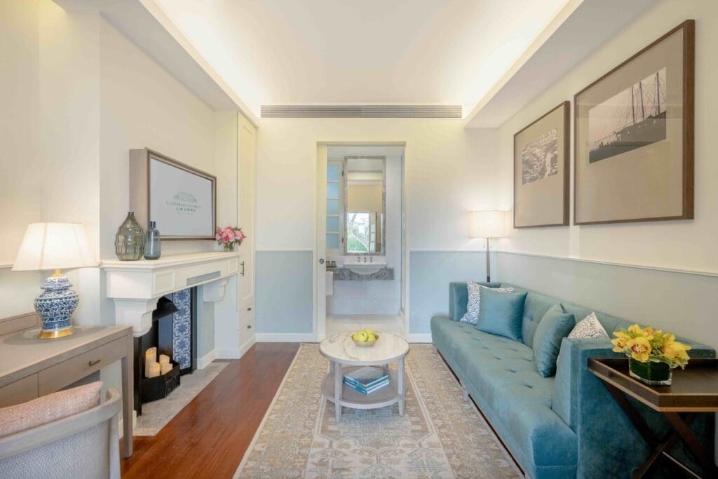 Mais plus encore, l’architecte de l’administration s’attacha à conserver l’atmosphère cosy qu’appréciaient les officiers en poste, notamment dans les chambres avec leurs « vraies » cheminées à feu de bois à l’anglaise, leur tissu style cottage, leurs salles de bains à l’identique, avec leurs lavabos en grosse faïence. À l’entrée des neuf chambres, un cartouche discret rappelle leur usage. Une chance, dormir dans la 2111, dite Sea Tiger, nom d’un mont face à l’hôtel qui, de poste d’observation pour les officiers de garde grâce à sa situation dévoilant à 300 degrés la mer devint, en 1950, le mess des officiers en poste ou de passage, pour se relaxer, prendre un cherry, un whisky, un high tea. Comme sur la mère patrie. 100 % British.
