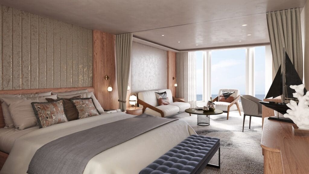 Une des Grandes Suites, sur le pont supérieur, 25 m2, avec coin salon, larges baies vitrées et pour certaines, un balcon privé. © DR