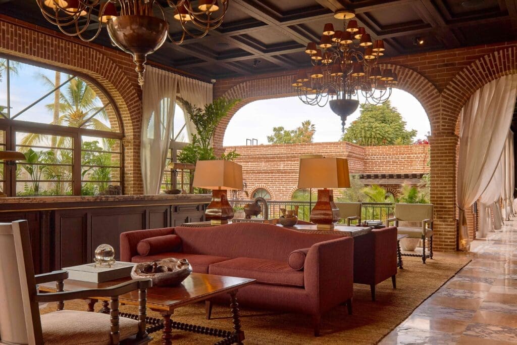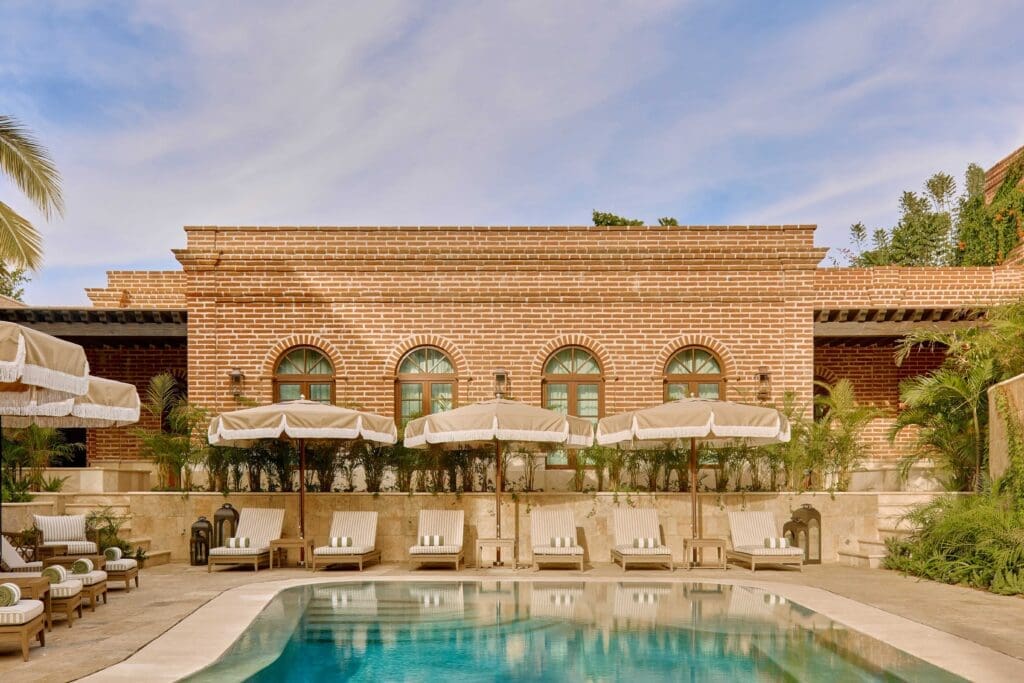 Coup de foudre garanti pour Todos Santos, ce « pueblo mágico » comme on appelle au Mexique les plus beaux villages. Celui-ci, côté Pacifique, avec sa végétation luxuriante, ses maisons basses colorées et sa joyeuse population bohème d’artistes et d’artisans, tranche avec la rigueur du désert. Le dernier-né des boutiques-hôtels, membre de Small Luxury Hotels of the World, incarne la quintessence de tout ce qui fait sa singularité et son cachet, à commencer par l’héritage historique : il redonne vie et splendeur à une hacienda bâtie à l’origine pour une comtesse espagnole, avec ses salons feutrés, ses terrasses rafraîchies par la brise, ses galeries extérieures hautes de plafond. Son restaurant méditerranéen 1890 occupe un ancien cinéma. Son bar, La Copa, était autrefois une école. Sur les murs, des fresques représentant des plantations de sucre et de maïs évoquent les activités agricoles traditionnelles de la région. D’autres peintures originales habillent le lobby et les dix chambres décorées de bois sombre et de miroirs dorés, qui portent toutes le nom d’une mission. La Santiago est la plus grande, la plus raffinée. Les hauts murs de briques couverts de lierre et percés de balcons ornés de ferronneries entourent la piscine du superbe patio végétalisé. À l’écart, bien cachée, la cave à vin abrite plus de 200 bouteilles, à découvrir lors de séances de dégustation.