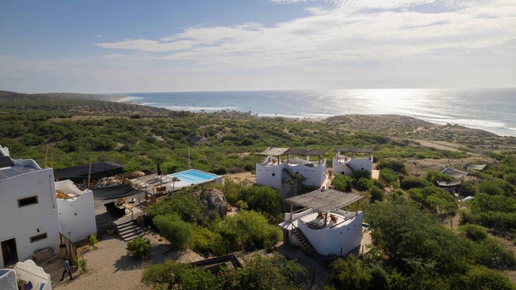 Blanc comme les maisonnettes à flanc de colline, bleu comme le ciel et la mer de Cortez à perte de vue : ce lodge-belvédère au bord de la piste accidentée qui relie la plage de East Cape et le parc national de Cabo Pulmo, entre rivages escarpés et criques désertes, bénéficie du plus beau des spots naturels. Avec un petit air du Cap en Afrique du Sud ou de Perth en Australie… Les hôtes des 10 suites le contemplent des heures durant depuis leur terrasse, la piscine, le restaurant locavore, le pavillon ouvert aux quatre vents, dédié au yoga et à la cérémonie du cacao, un rituel très étonnant pour qui veut vivre une vraie parenthèse spirituelle. À tester aussi, le temazcal, une hutte en terre, la version mexicaine du sauna. Et à saluer, les constructions traditionnelles en pierre et paille, les meubles fabriqués par des artisans locaux et le choix d’une énergie 100 % solaire.