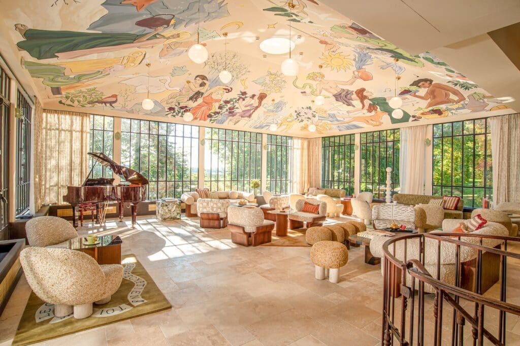 À une heure de Paris depuis la gare Saint-Lazare, 1 h 30 environ en voiture, le gros bourg, planté dans une campagne verdoyante flirtant avec le Perche, mérite qu’on le visite de long en large. Et a charmé Camille Omerin, 37 ans, à la recherche d’un lieu pour créer son premier hôtel. Après avoir lancé Maison Père, marque de mode, elle se consacre désormais à la décoration. Première réalisation, Verneuil la douce, base line « Demeure d’art », en lieu et place du Clos, l’un des plus anciens établissements estampillés Relais & Châteaux : « J’ai pris le risque d’imaginer, en toute liberté, un autre univers, le mien, et donc de le rebaptiser. » Camille s’improvise architecte d’intérieur, entourée d’artisans et d’artistes. Ségolène Derudder, illustratrice et muraliste, diplômée de Penninghen, école renommée en arts graphiques et architecture, répond présente, d’emblée. Ses fresques s’emparent, sans retenue, des plafonds, des murs du lobby, du grand salon, du restaurant et des suites. On aime ou pas son interprétation libre de scènes mythologiques, soulignées de phrases glanées dans des recueils de poésie par Camille.