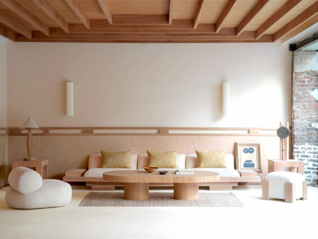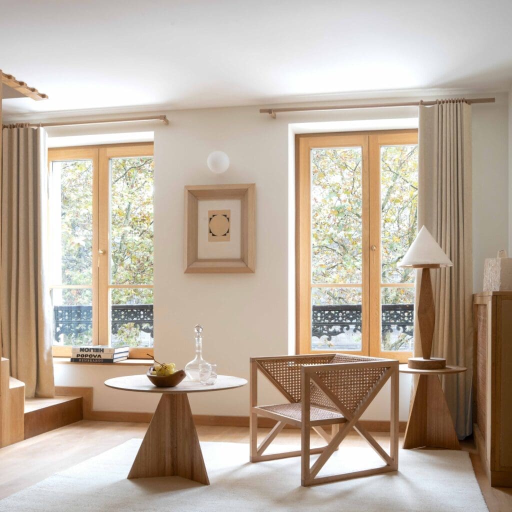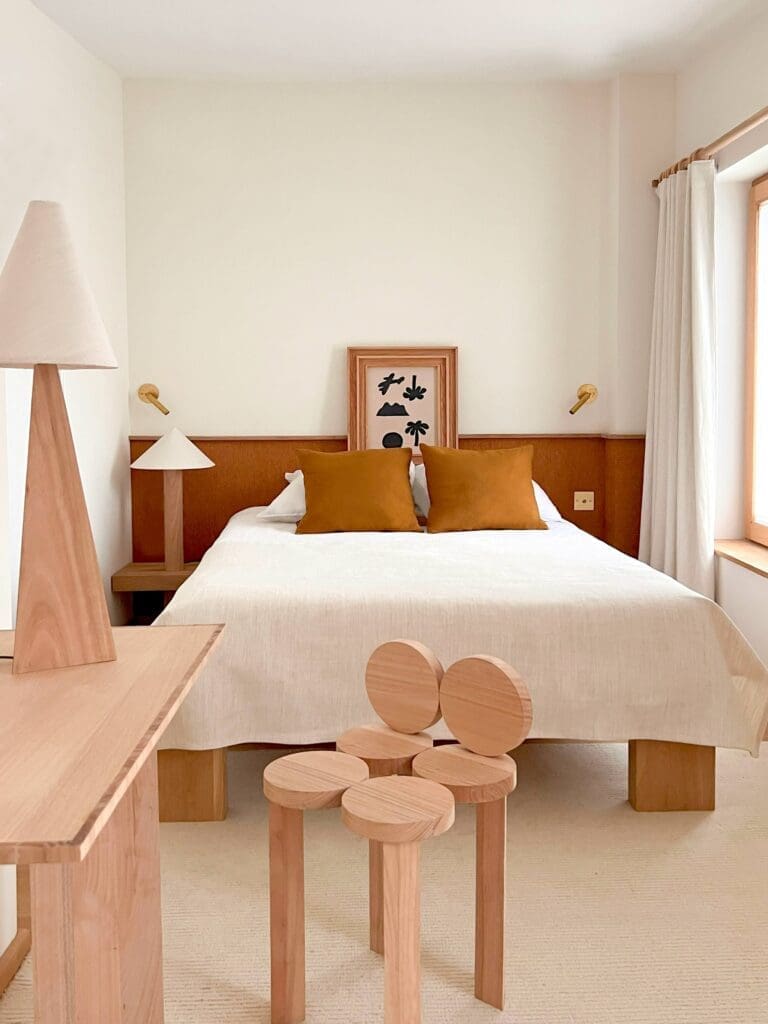« Dans mon studio, Policronica, j’ai dessiné tout le mobilier, la moindre chaise, la moindre table, la moindre étagère, le moindre luminaire. Ensuite, tout a été produit par mes équipes au Portugal dans une usine désaffectée que j’ai remise d’équerre », explique Julien Labrousse. L’eucalyptus, bois utilisé en priorité, impose dès le lobby son parfum mentholé, apaisant. « Habituellement, cette essence sert, au Portugal, à fabriquer du papier, note Julien Labrousse. Je l’ai détournée de son usage premier, séduit par sa couleur tendre, son aspect lisse, sa modestie. »