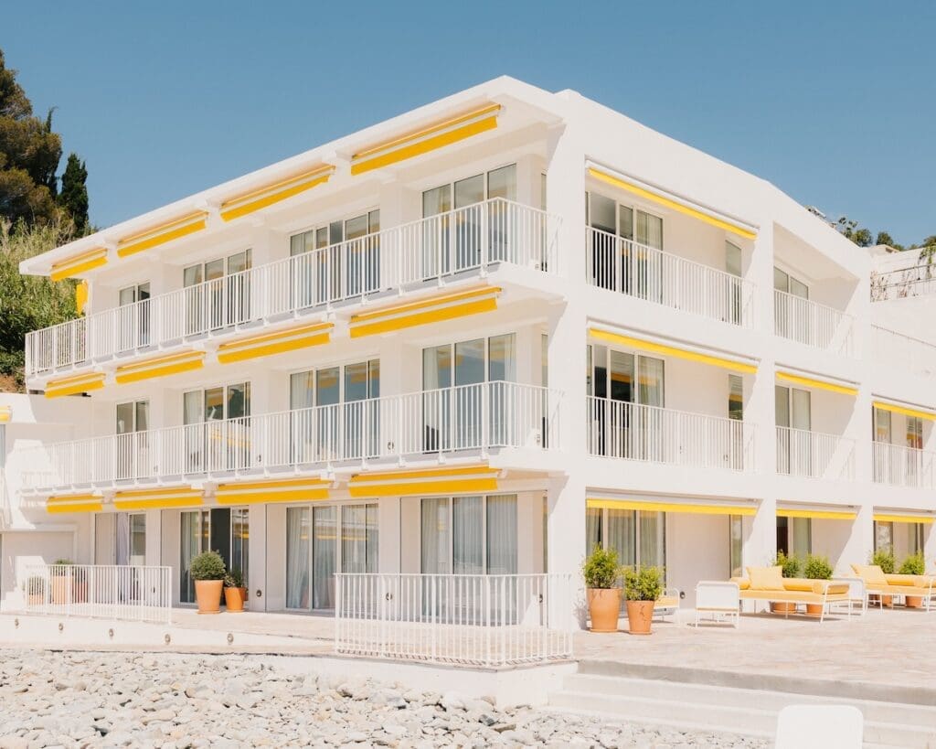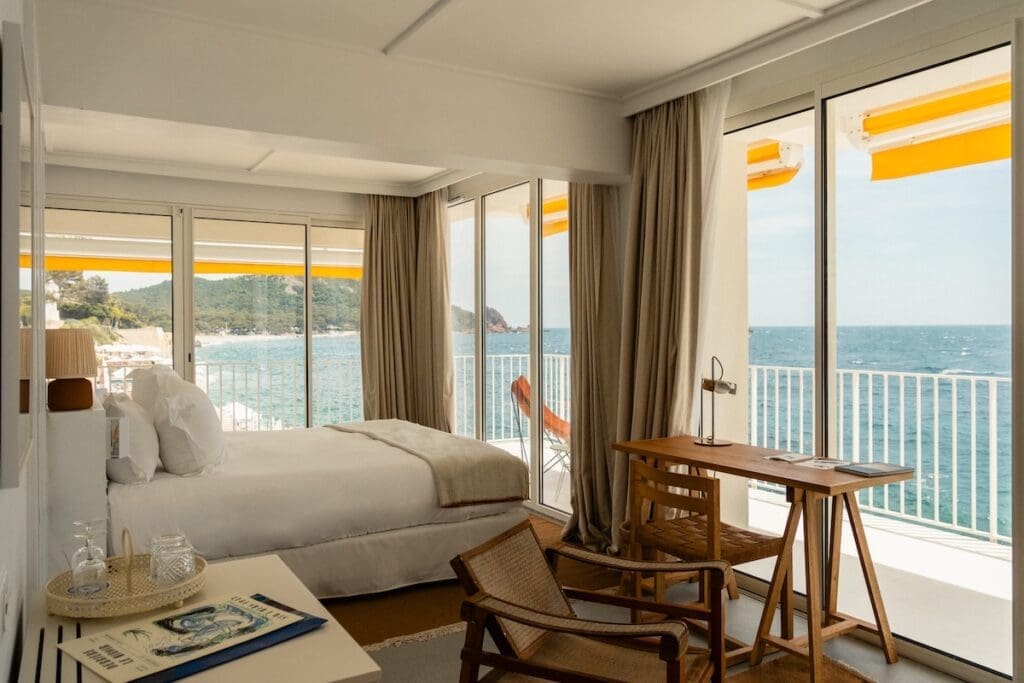 Alors que la pleine saison débute, le résultat est là, bluffant : l’extension de l’hôtel se fond dans le décor avec ses façades immaculées et ses stores jaune soleil, dans un style épuré, moderniste, qui fait écho à celui de la première bâtisse des Roches Rouges. « Des opportunités de mettre des clients devant la mer, à ce point, il n’en existe pas, note Antoine Ricardou. Nous voulions créer une coque, la plus neutre possible, pour faire vivre la Méditerranée. Son énergie, sa puissance sont exceptionnelles et pour les accueillir, il fallait de la neutralité. Ici, elle est dans un prisme cinématographique. »