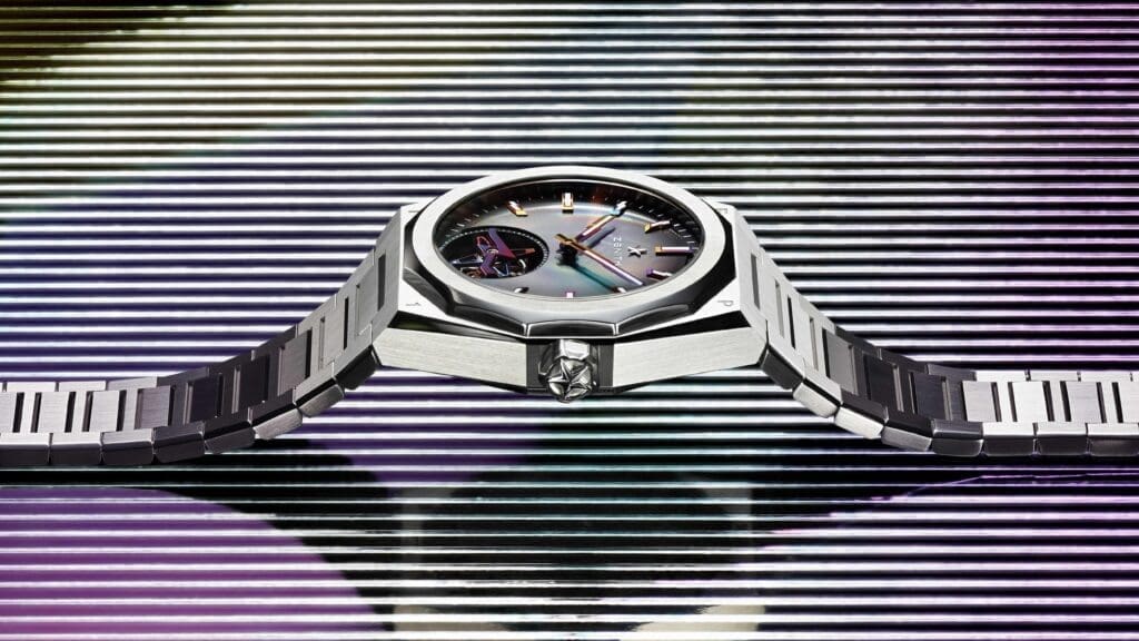 La Zenith Defy Skyline Tourbillon, inspirée par les œuvres de Pantone, témoigne donc d’un équilibre entre esthétique et ingéniosité horlogère. Après des collaborations avec d’autres marques, comme Hennessy, son travail avec Zenith lui a permis de plonger dans le monde de l’horlogerie, d’apprendre les processus de fabrication et de collaborer étroitement avec des designers. Pantone évoque également l’importance du temps dans son travail. Pour lui, le passé enrichit notre culture et influence sa création artistique, situant ainsi son œuvre à la croisée des chemins.