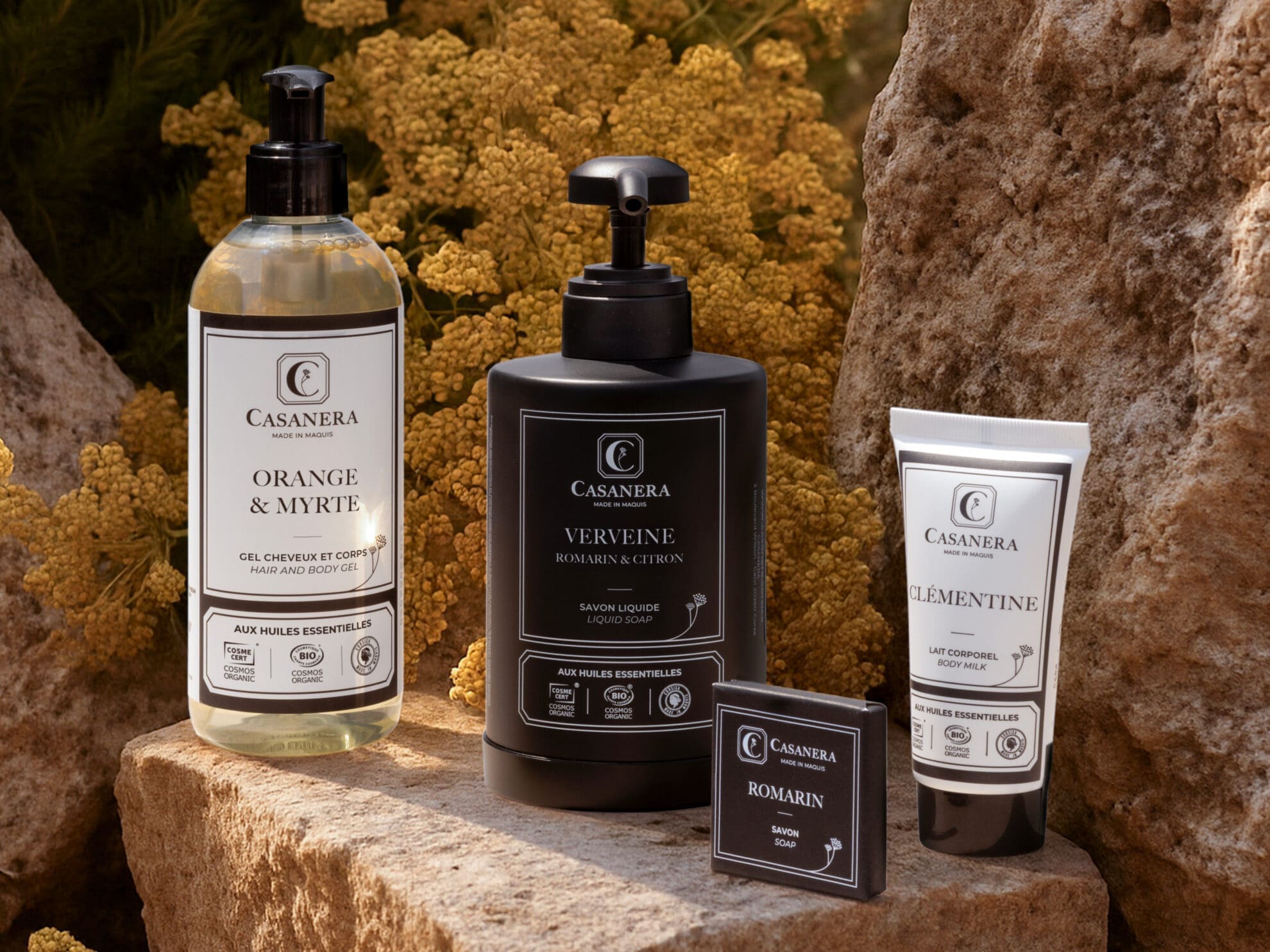Fidèle à son exigence de qualité, Casanera s’associe au Groupe GM, leader mondial des produits d’accueil hôteliers, pour créer une ligne exclusive dédiée aux établissements haut de gamme. Cette collaboration met à l’honneur l’Île de Beauté, offrant aux hôtels de luxe et aux spas d’exception la possibilité de proposer à leurs clients une expérience de beauté unique, inspirée de la nature corse.