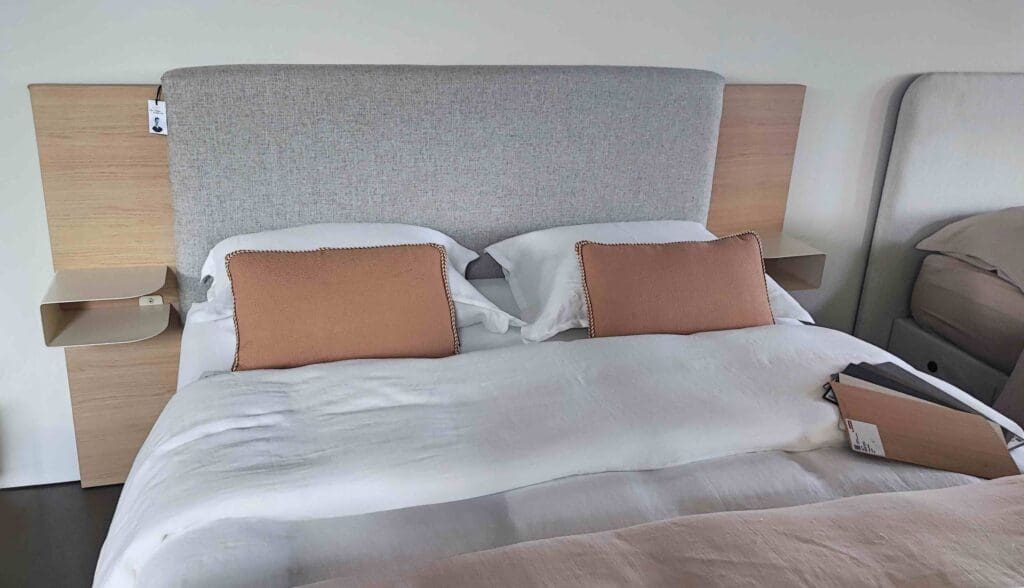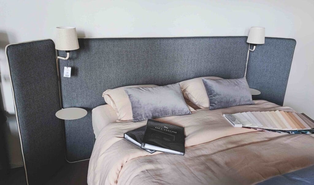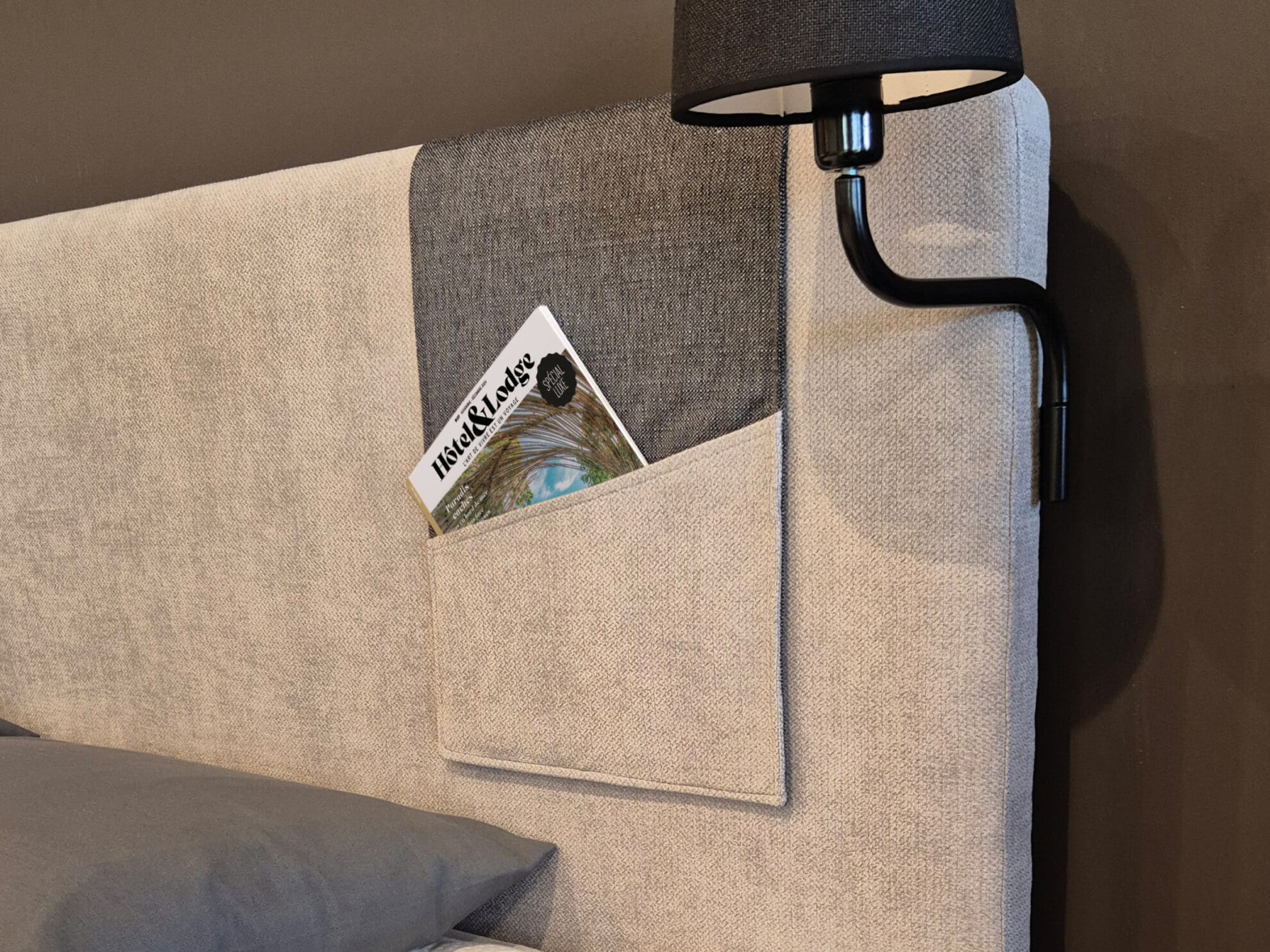 Chaque tête de lit peut être réalisée sur mesure avec un ou plusieurs accessoires : pochettes amovibles, luminaires, tablettes de chevet et branchements électriques et de connexion numérique.